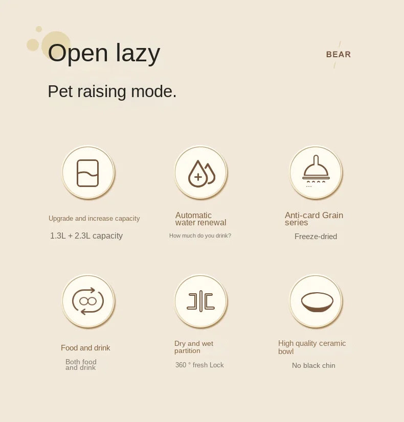 A detachable ceramic bowl prevents black chin, while the splash guard keeps water off the food.